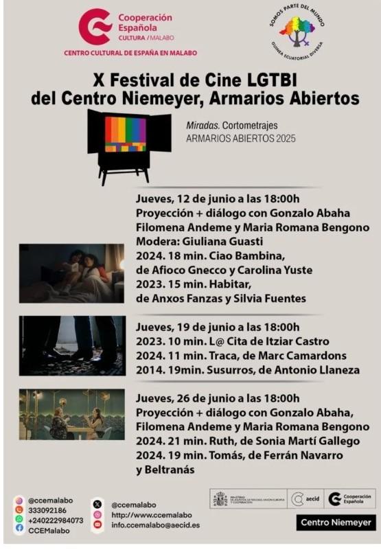 Este jueves 12 de junio ha dado comienzo en Malabo el X Festival de Cine LGTBI del Centro Niemeyer, Armarios Abiertos, una cita que reúne cortometrajes de temática diversa y un espacio de reflexión compartido, bajo el lema “Miradas”. La programación se extenderá hasta el 26 de junio, con proyecciones cada jueves en el Centro Cultural de España en Malabo.