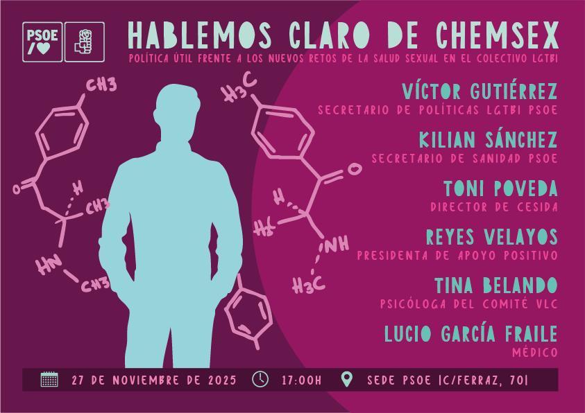 El PSOE ha celebrado en su sede de Ferraz una jornada titulada “Hablemos claro de chemsex: política útil frente a los nuevos retos de la salud sexual en el colectivo LGTBI”, un encuentro centrado en analizar el fenómeno del chemsex y su impacto en la salud comunitaria, así como en plantear respuestas políticas y sanitarias adaptadas a esta realidad emergente.