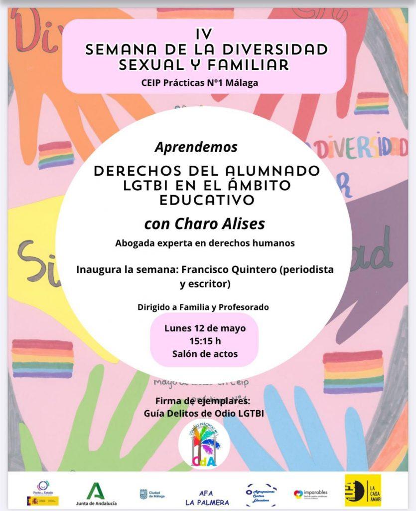 El próximo lunes 12 de mayo, el CEIP Prácticas Nº1 de Málaga dará inicio a su IV Semana de la Diversidad Sexual y Familiar con una esperada inauguración que contará con el periodista Francisco Quintero y la abogada Charo Alises como protagonistas del acto.