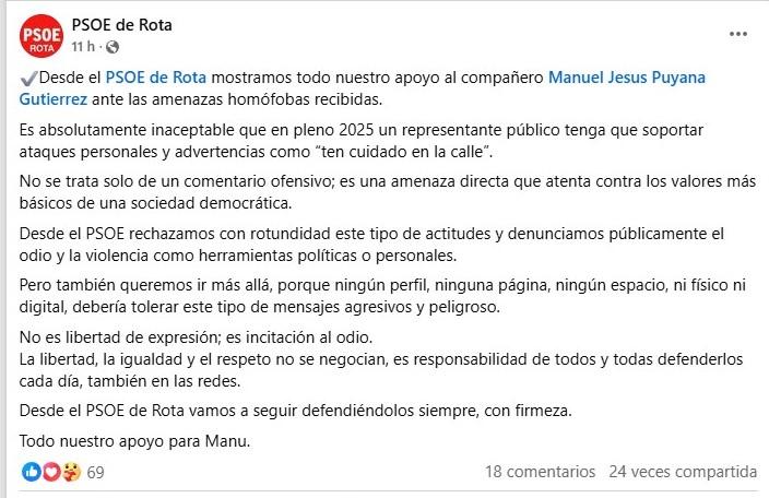El Partido Socialista Obrero Español (PSOE) de Rota ha emitido un contundente comunicado a través de sus redes sociales en apoyo a su compañero Manuel Jesús Puyana Gutiérrez, quien recientemente ha sido víctima de amenazas de carácter homófobo en la misma red social. Entre los mensajes recibidos, destacan expresiones como “ten cuidado en la calle”, que han encendido todas las alarmas por su carácter claramente intimidatorio.