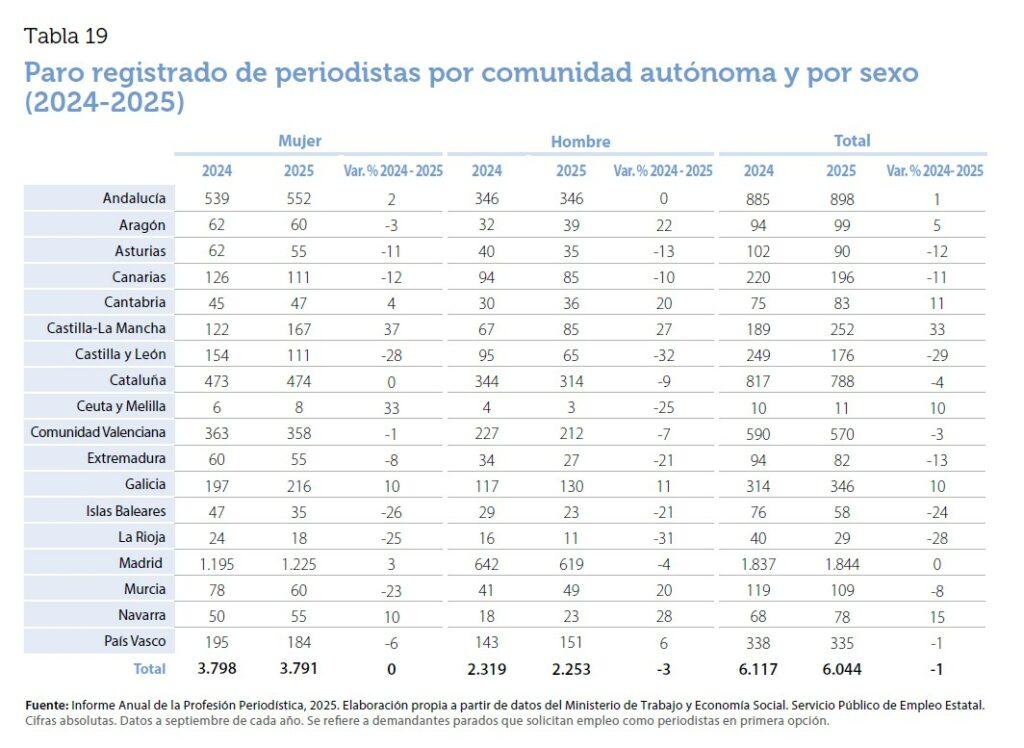 Entre los pocos datos positivos del informe destaca la reducción del paro en la profesión por segundo año consecutivo. En 2025, el desempleo desciende un 1,2%, lo que supone algo más de 70 personas menos sin trabajo. Entre septiembre de 2024 y de 2025, 6.044 personas solicitaron empleo como periodistas en primera opción. No obstante, el informe advierte de que estas cifras no incluyen a los recién graduados ni a quienes no figuran en los registros oficiales, por lo que el paro real podría ser superior.