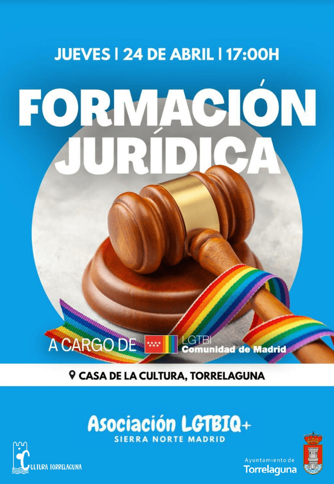 El próximo jueves 24 de abril a las 17:00 horas, la Casa de la Cultura de Torrelaguna abrirá sus puertas para acoger una jornada de formación jurídica orientada especialmente a personas del colectivo LGTBIQ+, así como a cualquier asistente interesado en conocer más a fondo sus derechos y recursos legales.