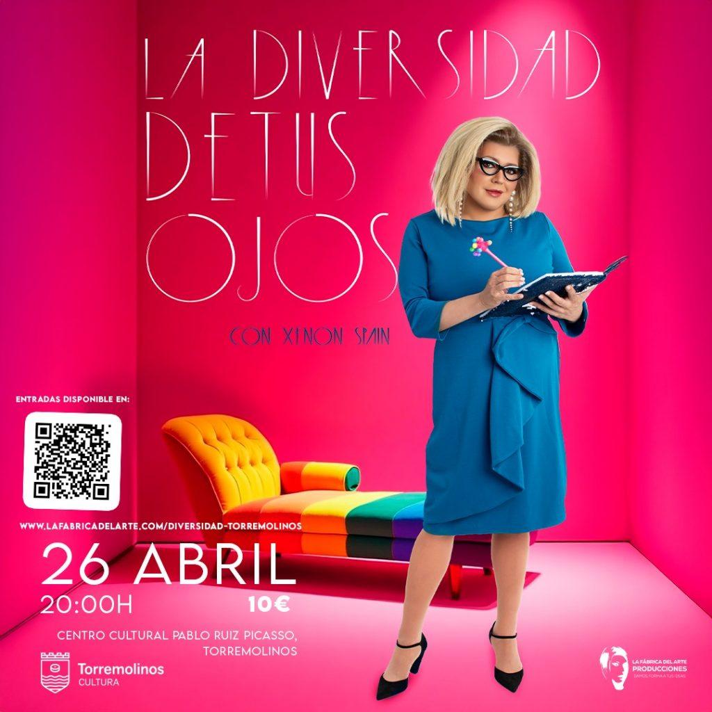 Torremolinos, 15 de abril de 2025.- La cultura y la diversidad se suben al escenario con el estreno de la segunda temporada de la comedia teatral ‘La diversidad de tus ojos’, protagonizada por la reconocida artista Xenon Spain. El espectáculo tendrá lugar el próximo 26 de abril a las 20:00 horas en el Centro Cultural Pablo Ruiz Picasso, y las entradas ya están disponibles en la web oficial www.lafabricadelarteproducciones.com a un precio de 10 euros.