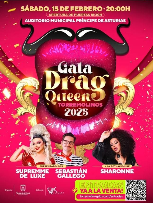 El auditorio municipal Príncipe de Asturias de Torremolinos acogerá, el próximo sábado 15 de febrero a las 20:00, la Gala Drag Queen 2025. La ceremonia será presentada por Supremme de Luxe y Sebastián Gallego y contará con la actuación musical de la drag queen Sharonne. Aunque el inicio de la gala esté previsto para las 20:00, la apertura de puertas del recinto para el público general se llevará a cabo a partir de las 18:30.